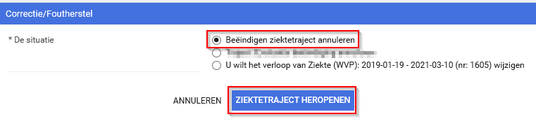 Stap 2. Kies vervolgens voor de optie Beëindigen ziektetraject annuleren en druk op de blauwe knop Ziektetraject heropenen.