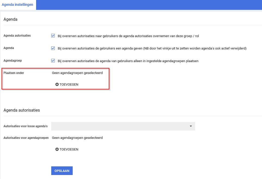Als je bovenstaande stappen hebt doorlopen kan je gebruikers autoriseren voor de agendagroep. Dit is te lezen in het artikel: Autorisaties voor de agenda en de gebruiker.