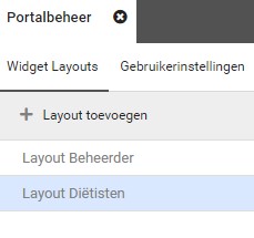 Stap1: Open de beheer pagina via Beheer in het hoofdmenu. Klik op Applicatie instellingen en selecteer het item Portal beheer. Selecteer het Widgets lay-outs tabblad.