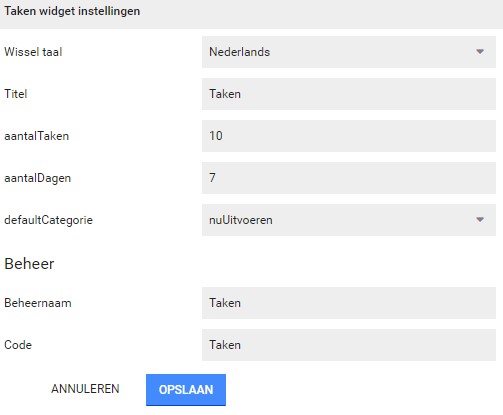 Stap 4: Geef de Widget een titel, beheernaam en code (gelijk aan beheernaam). De overige velden zijn widget afhankelijk en kunnen naar de wensen van de klant ingevuld worden. Klik vervolgens op Opslaan.