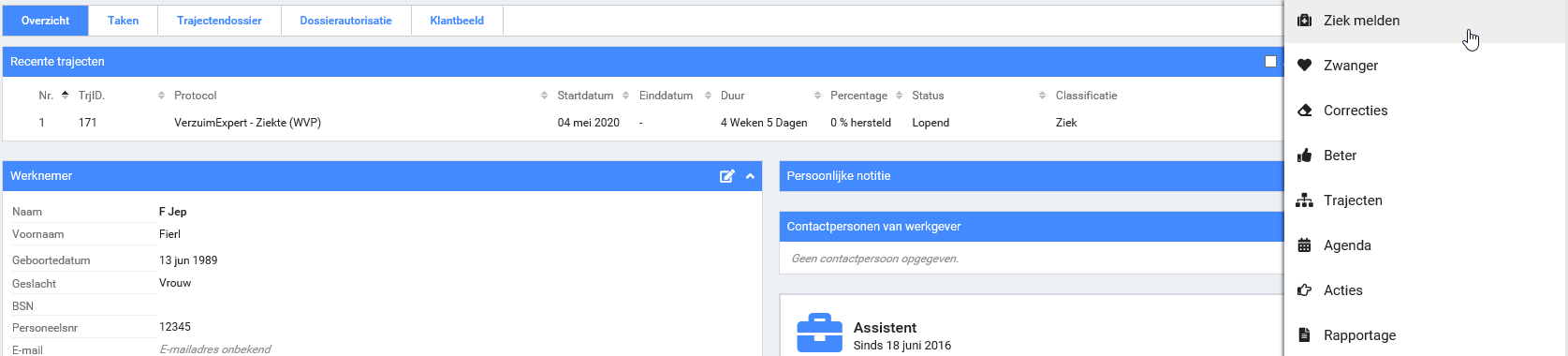 Stap 1: Klik in het overzicht van de werknemer op Acties en kies voor Ziek melden.