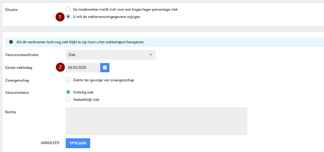 Stap 2: Wil je de startdatum wijzigen, dan selecteer je U wilt de ziekteverzuimgegevens wijzigen en wijzigt daarna de 1e ziektedag.