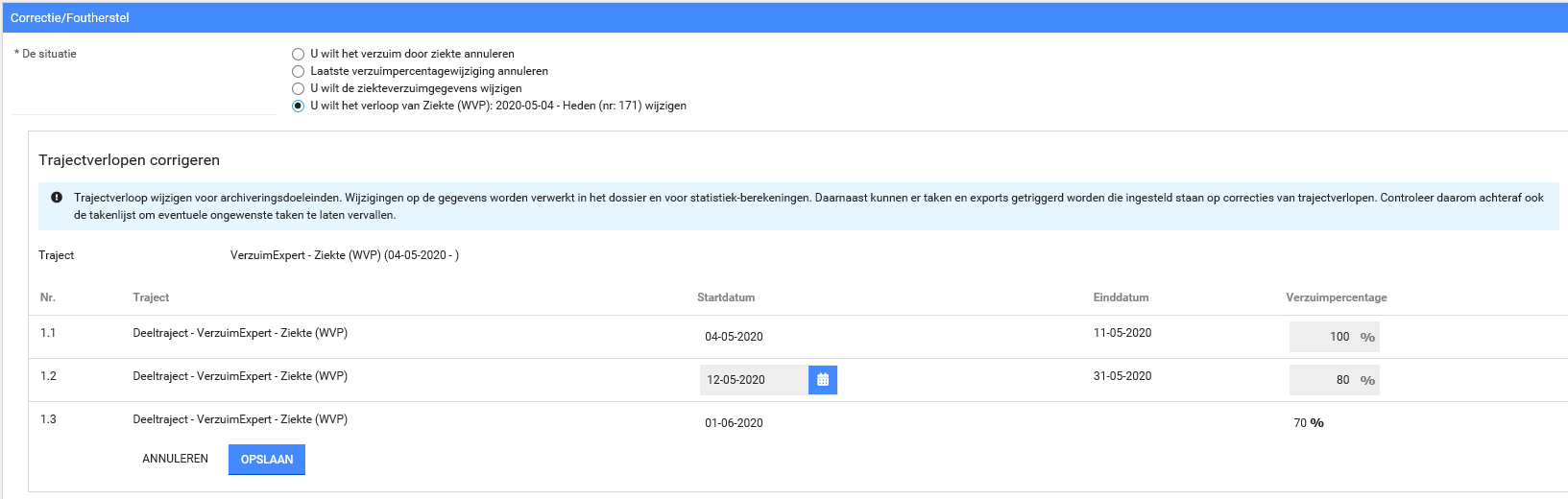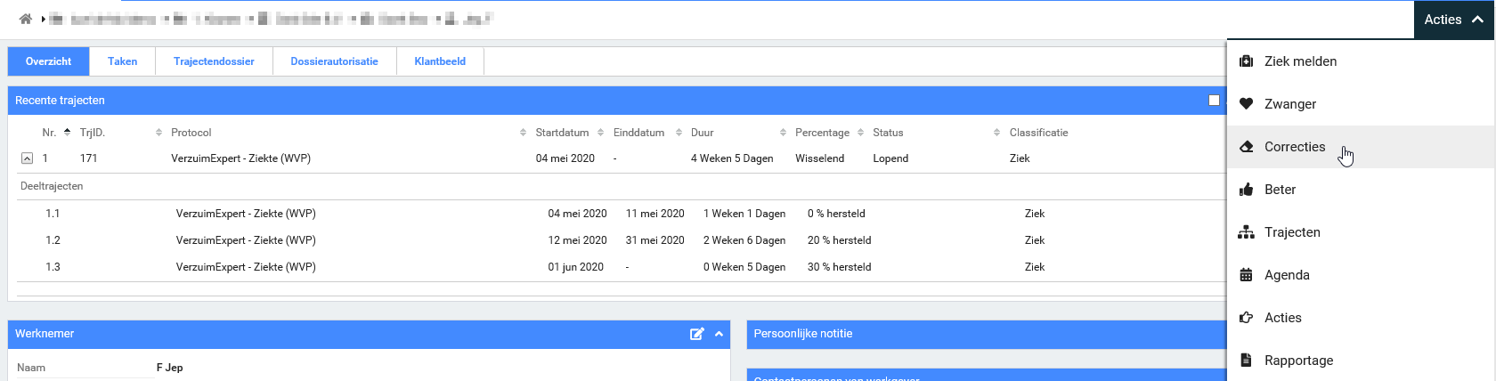 Stap 3: Wil je de startdatum van een deeltraject of verzuimpercentage wijzigen? Klik dan op Acties in het overzicht en kies voor Correcties.