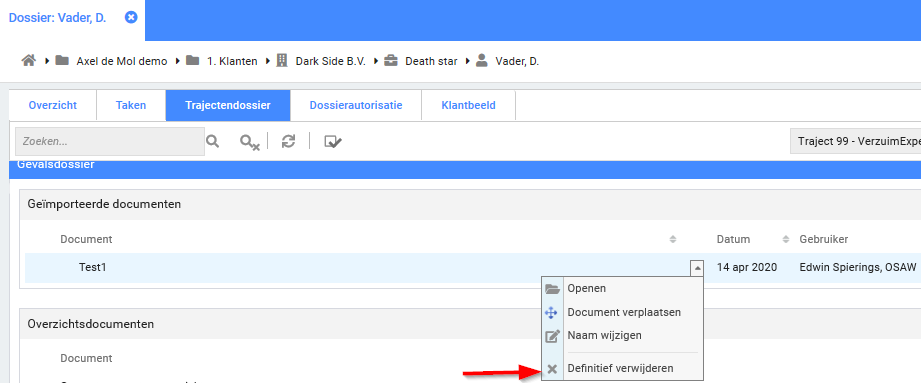 Om een geüpload document te kunnen verwijderen moet het account van de gebruiker zijn geautoriseerd voor het verwijderen van geüploade documenten. Het woord “geüpload” is in VX Portal “geïmporteerd”. Na het selecteren van het dossier worden de volgende stappen doorlopen.