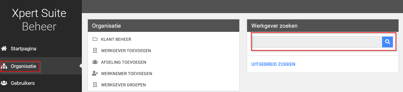 Stap 5: Zoek de werkgever waarvoor je de contactgegevens wil wijzigen via Organisatie en vervolgens de optie Werkgever zoeken.
