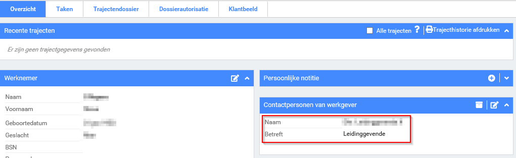 Stap 9: Op het tabblad Overzicht in het dossier staat rechts Contactpersoon van werkgever. Indien er een leidinggevende van de afdeling is toegevoegd, staat deze leidinggevende hier aangegeven.