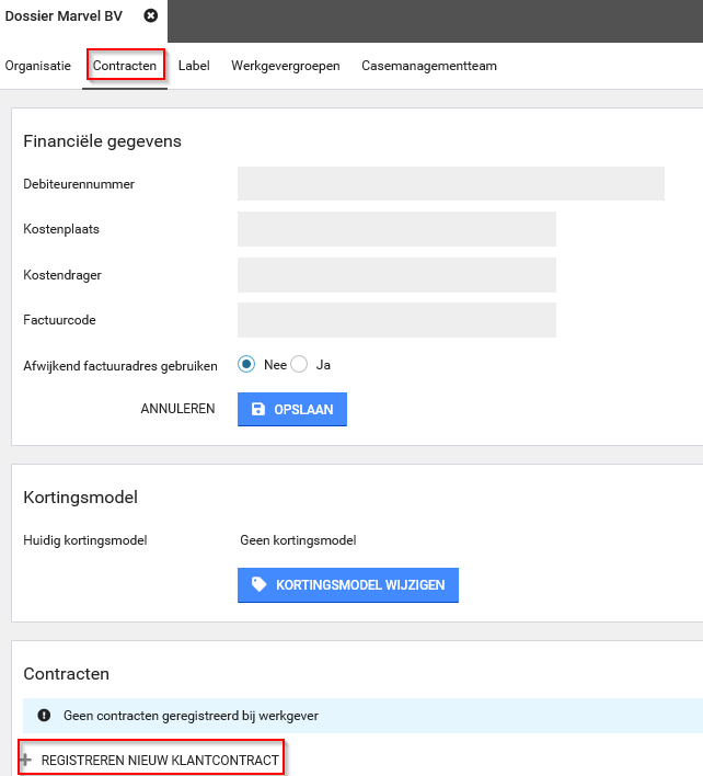 Stap 3: Onder de tab Contracten en vervolgens de knop Registreren nieuw klantcontract kunnen de contractgegevens van de werkgever worden opgevoerd.