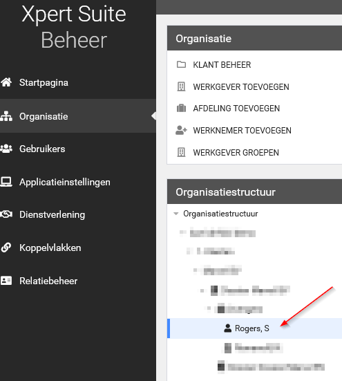 Stap 4: Indien de werknemer al is opgevoerd, kan het huidige dienstverband worden gewijzigd of er kan een dienstverband worden toegevoegd. Klik in het linker menu op Organisatie, zoek vervolgens de werknemer in de Organisatiestructuur en klik op de naam.