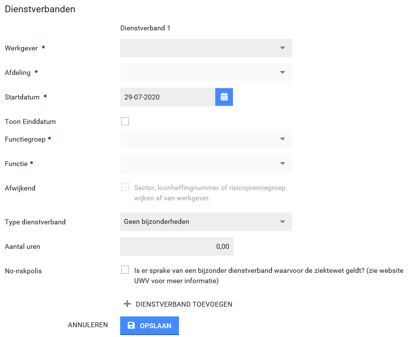 Stap 6: Klik onderaan op Dienstverband toevoegen en voer de gegevens van het nieuwe dienstverband op.