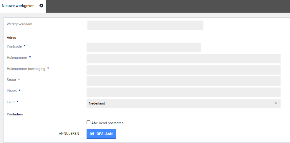 Stap 3: Vul alle gegevens in (verplichte velden worden aangegeven met *) en klik op Opslaan. De werkgever is toegevoegd.