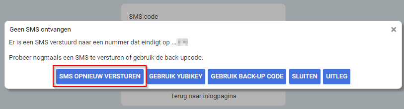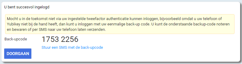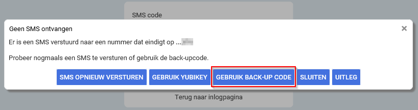Tijdens het aanmaken van je account is er een back-up code gegeven. Met deze eenmalige back-up kan worden ingelogd als je geen telefoon of Yubikey bij de hand hebt.