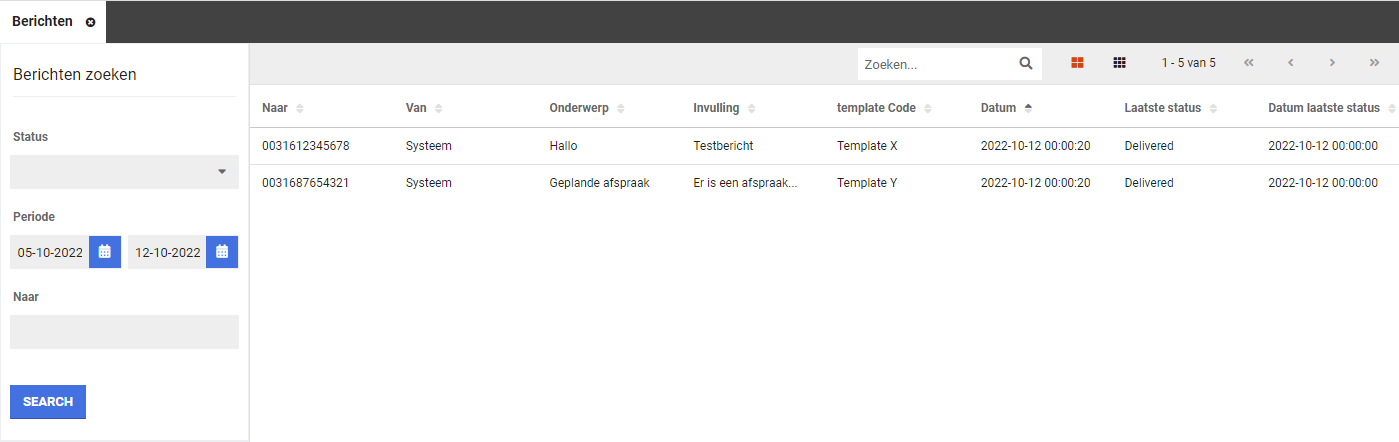 Om inzicht te geven in verstuurde SMS berichten en hun status vanuit de XpertSuite, is het mogelijk om via beheer deze status op te zoeken.