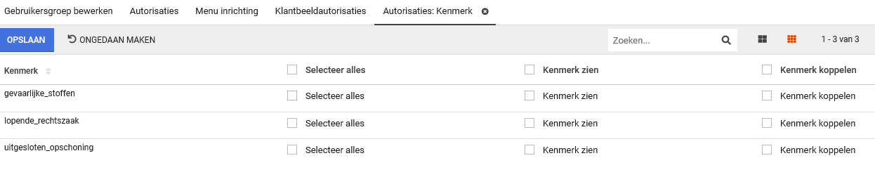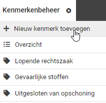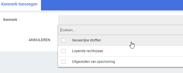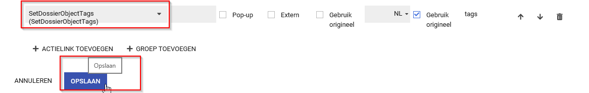 Om de juiste actielink te vinden kan je het volgende intypen in de zoekbalk: SetDossierobjecttags. Voeg hier de gewenste kenmerken op. Vergeet niet alle wijzigingen op te slaan.