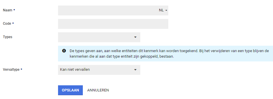 Bij Vervaltype kun je aangeven of een kenmerk nooit komt te vervallen, of vervallen optioneel is of dat het kenmerk vervalt.