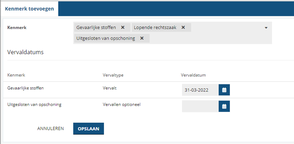 Wanneer een kenmerk een verplichte vervaldatum heeft, zal deze opgevoerd moeten worden. Wanneer de vervaldatum optioneel is hoeft er geen einddatum opgevoerd te worden. Elke nacht zal het systeem automatisch checken of er kenmerken aanwezig zijn die moeten vervallen, welke dan ook automatisch worden verwijderd op de entiteiten (werkgever, afdeling, werknemer, traject) waar het te vervallen kenmerk aan is toegekend.