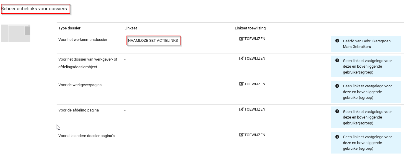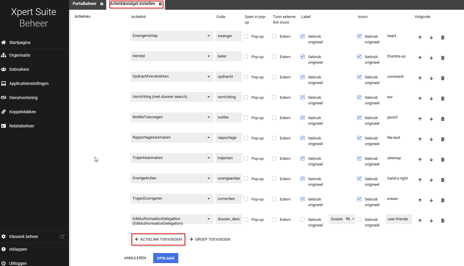 Selecteer de juiste groep in het linker menu en klik bij “beheer actielinks voor dossier” op onderstaande knop.