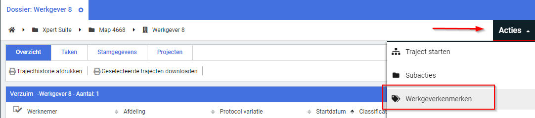 Voor werkgevers, afdelingen en werknemers zijn nieuwe actielinks beschikbaar om de gewenste kenmerken toe te kennen en in te kunnen zien. De gewenste actielinks kunnen toegevoegd worden via Portalbeheer onder de namen ‘SetEmployerTags’, ‘SetDepartmentTags’ en ‘SetDossierObjectTags’.