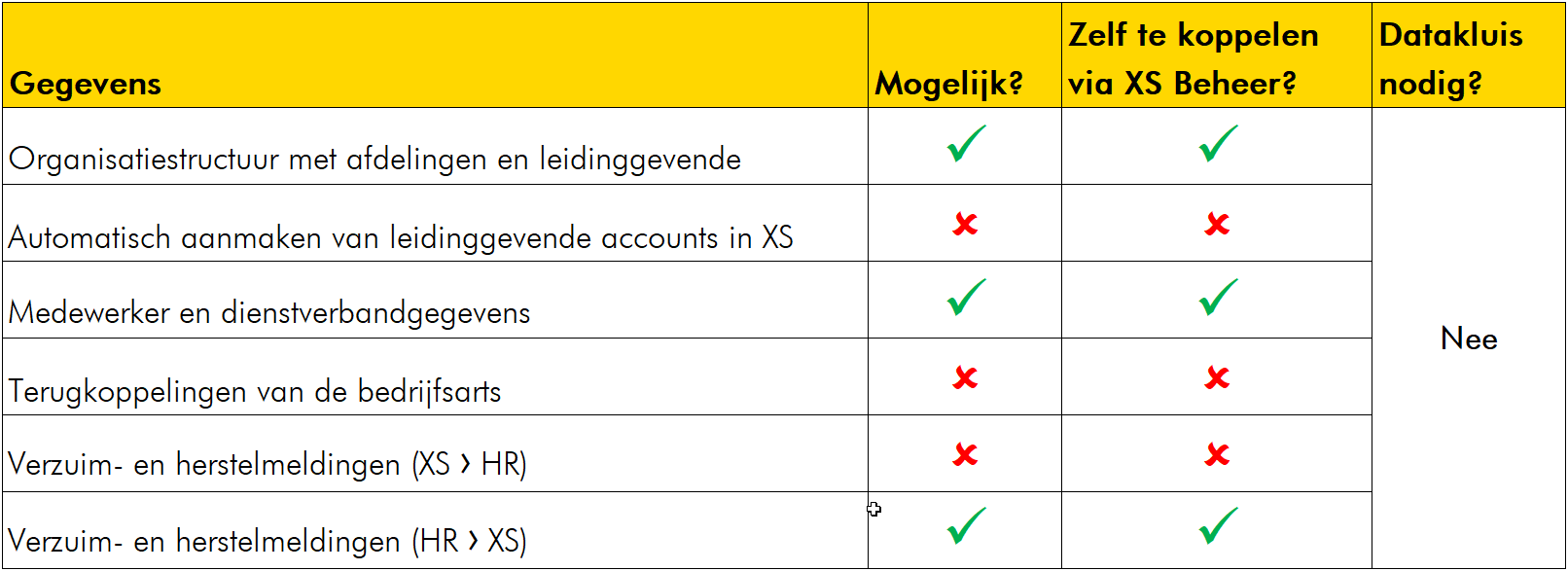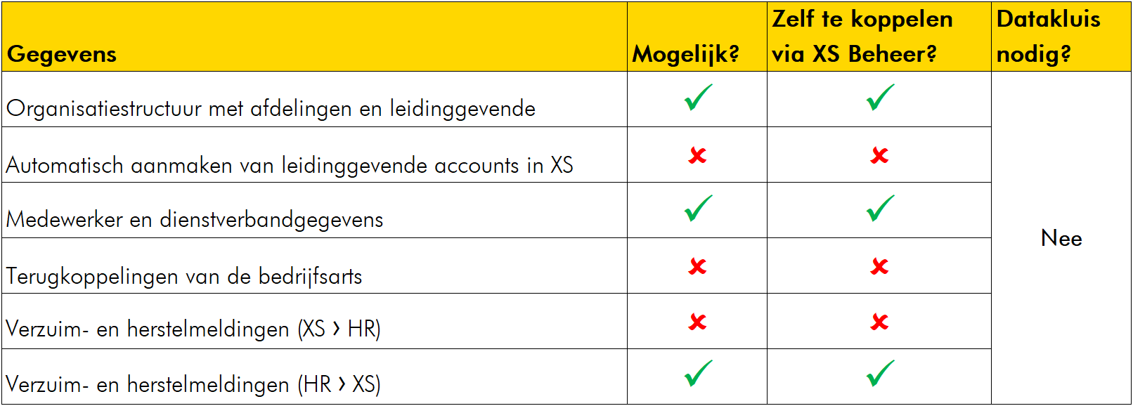 Je kunt de Xpert Suite ook koppelen met Centric. Dit kunnen wij voor je doen, maar een aantal koppelingen kun je ook zelf leggen via XS Connect. Zie in de onderstaande tabel welke gegevensstromen we allemaal kunnen koppelen. En of je dit zelf kunt via XS Connect.
