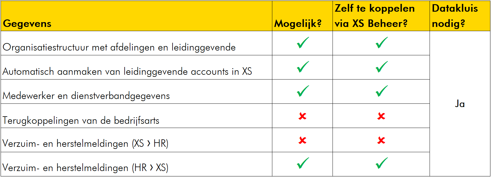 Je kunt de Xpert Suite ook koppelen met Oracle. Dit kunnen wij voor je doen, maar je kunt het ook zelf via XS Connect. Zie in de onderstaande tabel welke gegevensstromen we allemaal kunnen koppelen. En of je dit zelf kunt via XS Connect.