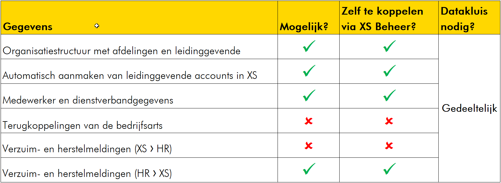 Je kunt de Xpert Suite ook koppelen met SAP. Dit kunnen wij voor je doen, maar je kunt het ook zelf via XS Connect. Zie in de onderstaande tabel welke gegevensstromen we allemaal kunnen koppelen. En of je dit zelf kunt via XS Connect.
