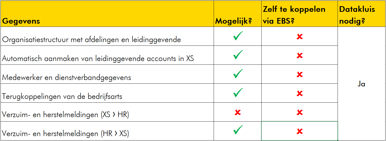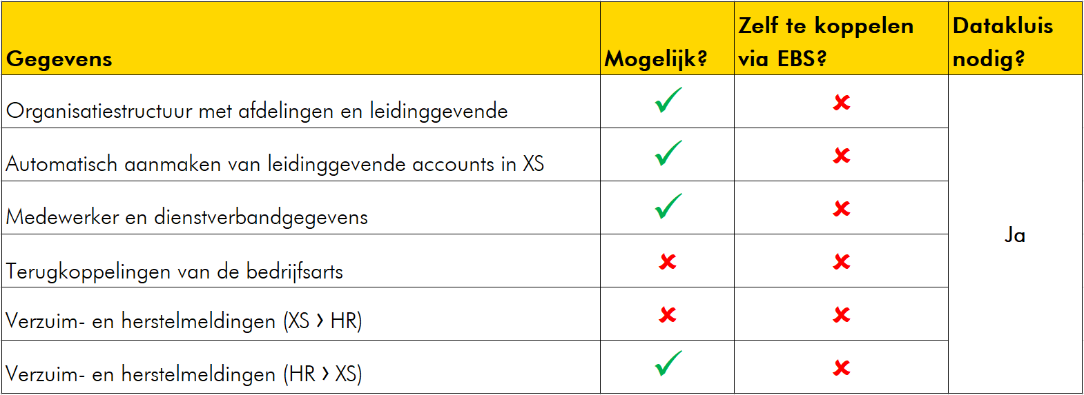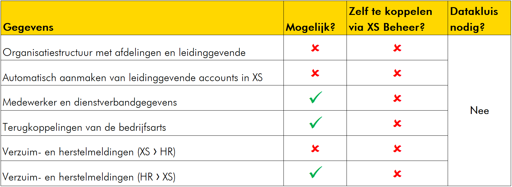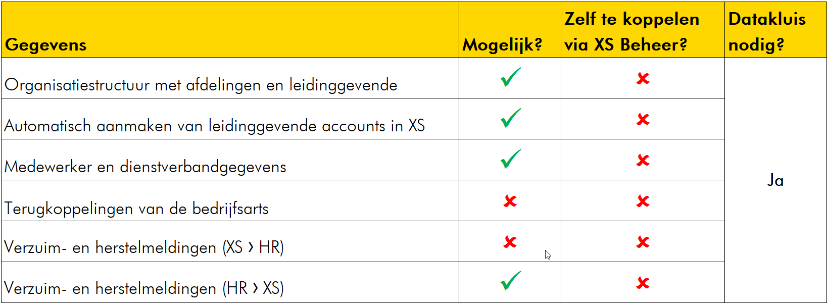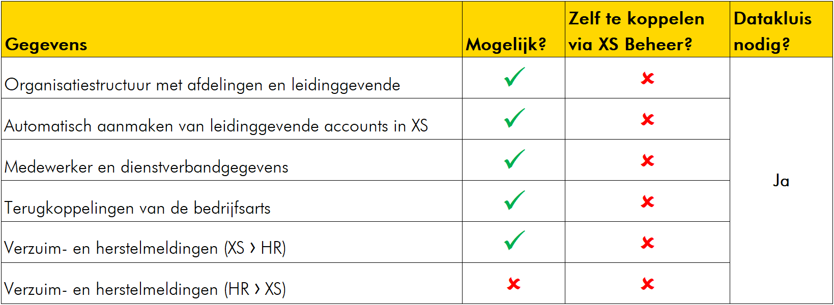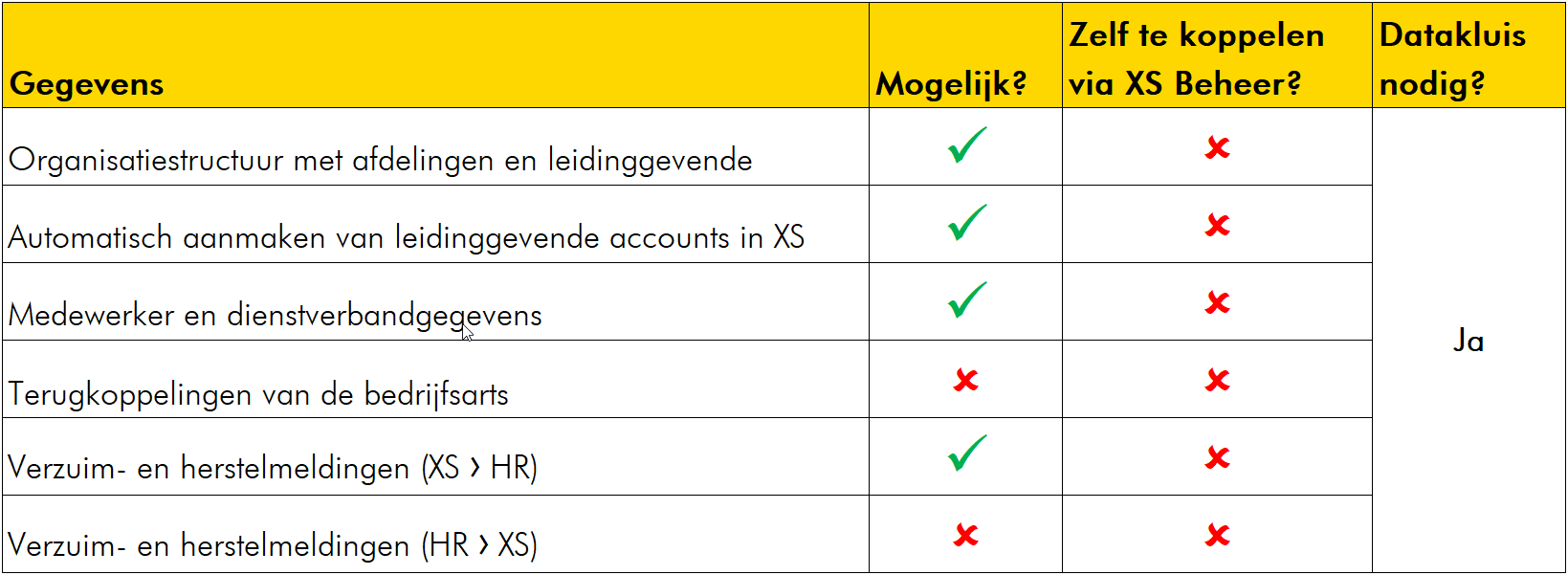 Je kunt de Xpert Suite ook koppelen met de HR Core-systemen of Visma Talent & Salaris van Visma. Dit kunnen wij voor je doen, maar je kunt het ook zelf via ons koppelplatform. Zie in de onderstaande tabel welke gegevensstromen we allemaal kunnen koppelen. En of je dit zelf kunt via ons koppelplatform.