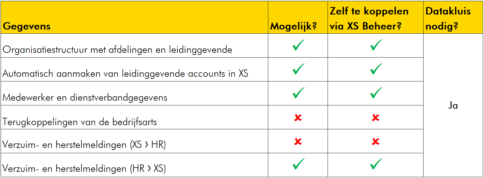 Je kunt de Xpert Suite ook koppelen met Workday. maar een aantal koppelingen kun je ook zelf leggen via XS Connect. Zie in de onderstaande tabel welke gegevensstromen we allemaal kunnen koppelen. En of je dit zelf kunt via XS Connect.