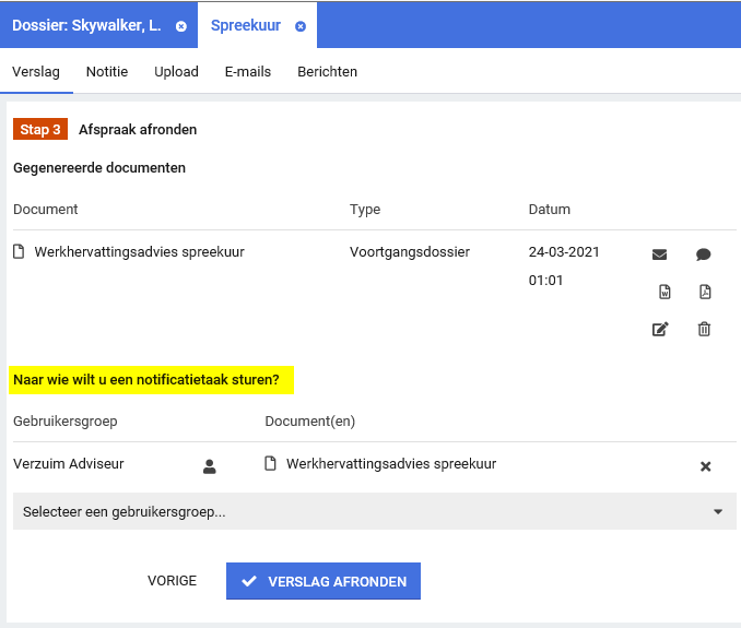 - De bedrijfsarts maakt in één scherm zijn verslaglegging; deel a komt terug in een automatisch gegenereerd document wat in het gevalsdossier verschijnt, inzichtelijk voor zowel de casemanager als de leidinggevende als de medewerker (mits laatstgenoemde ook in het systeem zit); deel b komt terug op de medische kaart in het medisch dossier, welke alleen voor rollen met medische rechten zichtbaar is.