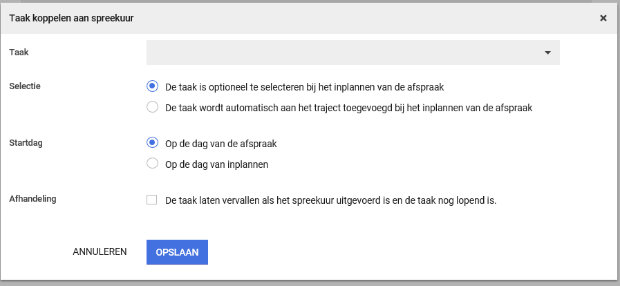 Er kan een specifieke taak gekoppeld worden aan het spreekuur met verschillende opties wanneer deze taak moet verschijnen.