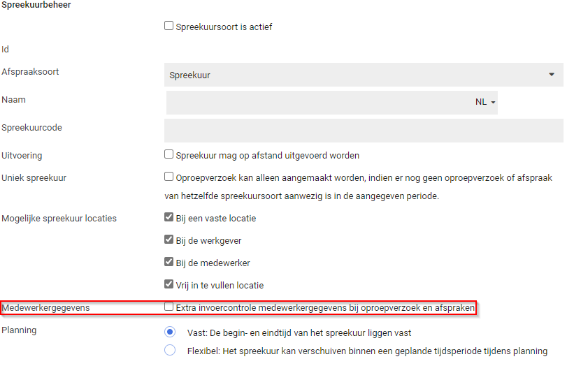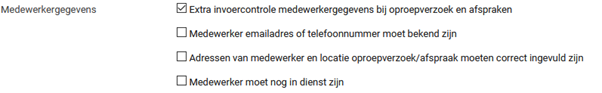 Om te borgen dat alle noodzakelijke informatie beschikbaar is bij het het plannen en uitvoeren van afspraak, kunnen extra invoercontroles op medewerkersgegevens ingesteld worden bij het aanmaken van een oproepverzoek of afspraak. Welke extra controles gewenst zijn, is instelbaar per spreekuursoort (Dienstverlening > Spreekuursoorten).