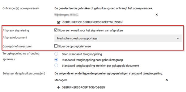 Hier kan men een gebruiker of gebruikersgroep selecteren die het oproepverzoek ontvangt, zodra er een verzoek is gedaan om dit spreekuur in te plannen. De verdere uitleg van oproepverzoeken staat beschreven bij het onderdeel Agenda.