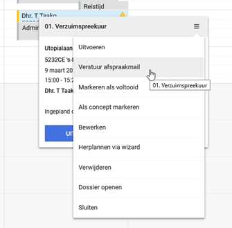 Wanneer het e-mailsjabloon en de spreekuursoorten zijn ingericht naar wens, kun je in agenda aan de slag met deze functionaliteit. In het menu van een afspraak is er een extra knop zichtbaar, om het bericht te mailen. Deze knop is alleen zichtbaar voor niet voltooide afspraken van een spreekuursoort met ingerichte afspraaksignalering.