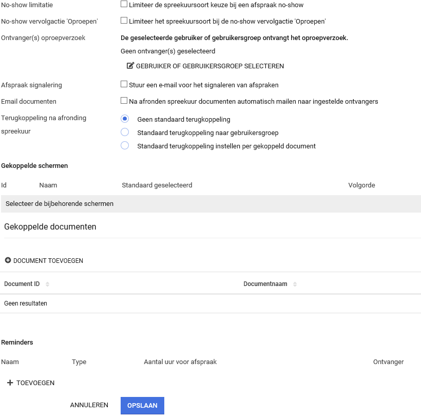 Bij het selecteren van deze optie, indien aangemaakt, verschijnt er het spreekuursoort ‘No show’, waarin bijvoorbeeld de No-show verrichting staat ingesteld.