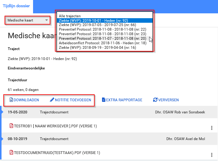 Binnen de medische kaart heb je een filtermogelijkheid, waardoor je per traject of van alle trajecten gezamenlijk medische gegevens kan raadplegen. Daarnaast kun je via de knop ‘notitie’ een notitie toevoegen aan de medische kaart en kun je via de knop ‘Downloaden’ de medische kaart downloaden.