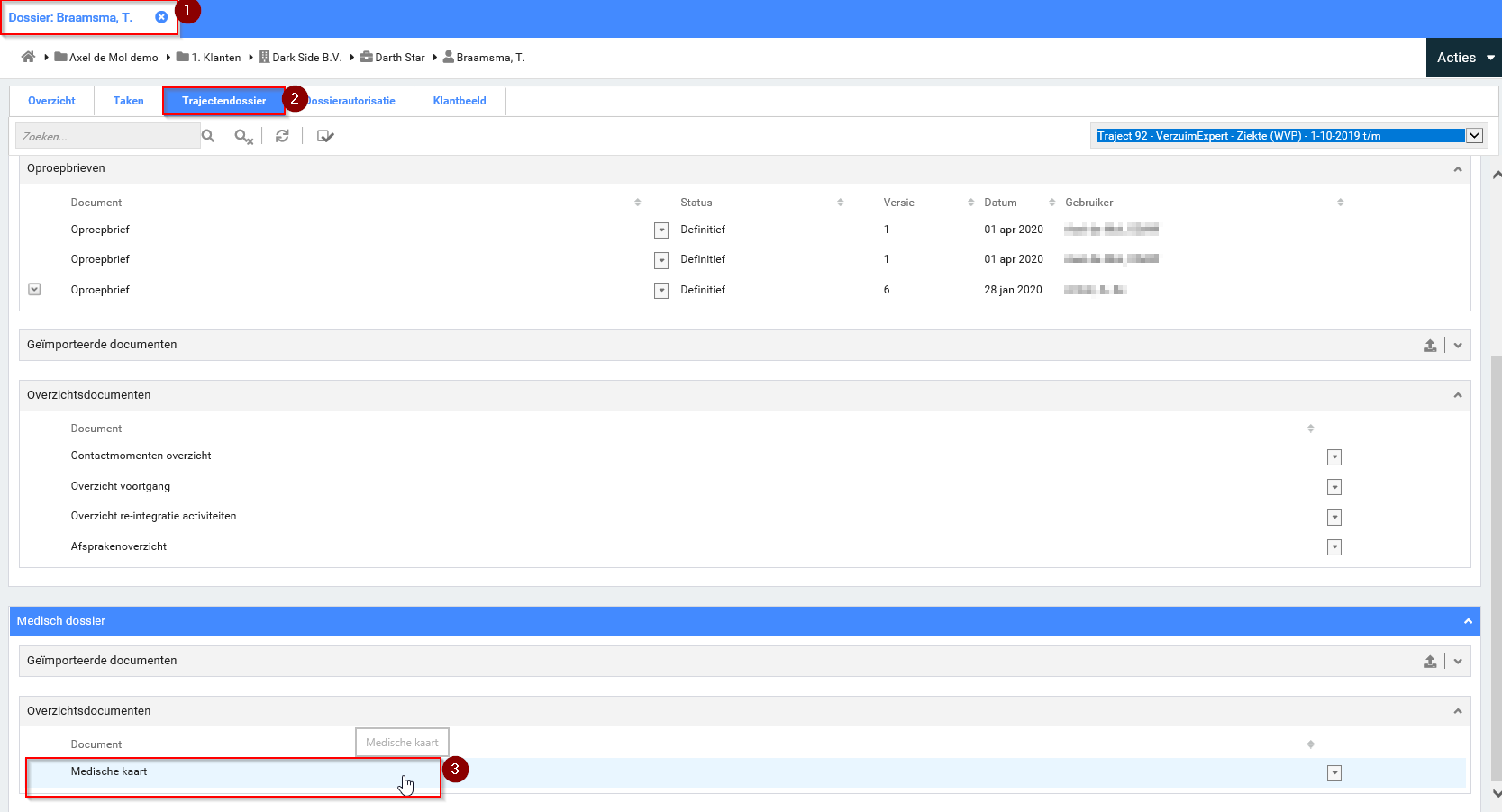 Binnen het trajectendossier is een apart overzichtsdocument beschikbaar waarin alle medisch gekenmerkte documenten en formuliervelden in verzameld worden; de Medische kaart.