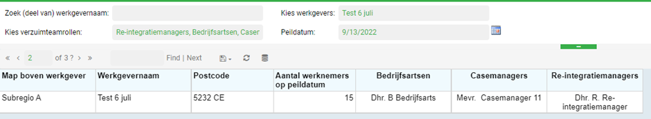 Er is een nieuw rapport 'Casemanagementteams per werkgever' ontwikkeld. Deze toont voor de geselecteerde werkgevers de verschillende verzuimteamrollen met de gebruikers die in deze rollen zitten. Verder worden nog een aantal anders gegevens over de werkgever getoond, zoals de map waarin de werkgever valt en het (geschatte) aantal werknemers op de peildatum.