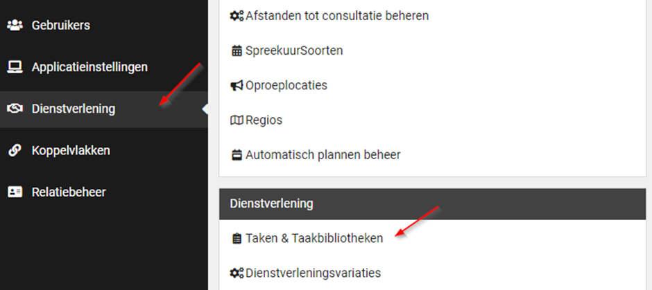 Het nieuwe taak- en taakbibliothekenbeheer is te vinden bij Dienstverlening > Dienstverlening > Taken & Taakbibliotheken