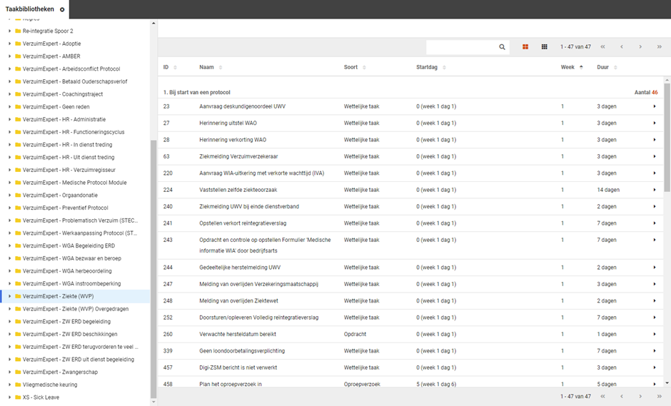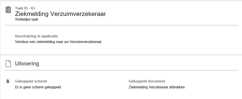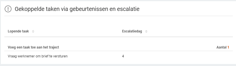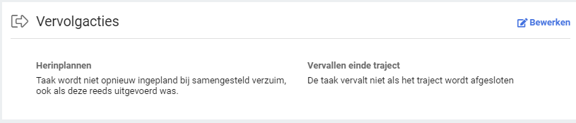 Voor standaard vervolgacties voor de taak zelf, is er het panel Vervolgacties, hier staat informatie of het standaard gedrag van de taak in reactie tot standaard trajectgebeurtenissen zoals samengesteld verzuim en het afsluiten van het traject.