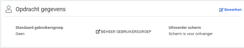 Voor bijzondere taken zoals standaard opdrachten komen er nog extra panels bij, beginnend met de Opdracht gegevens, waar enkele gegevens staan over de standaard gebruikersgroep die geselecteerd wordt bij het inschieten, en of het gekoppelde scherm door de opdrachtgever of de ontvanger ingevuld dient te worden.