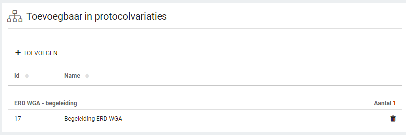 Binnen het panel ‘Toevoegbaar in protocolvariaties’ wordt inzichtelijk gemaakt aan welke protocolvariatie de eigen opdracht toegevoegd kan worden.