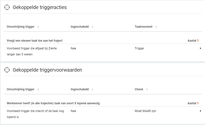 Het tweede & derde panel op dit tabblad geeft de trigger inrichting weer. Het panel ‘Gekoppelde triggeracties’ geeft aan welke triggers van toepassing zijn die iets met deze taak doen (bijvoorbeeld welke de taak toevoegen aan het traject, of de taak annuleerd). Het panel ‘Gekoppelde triggervoorwaarden’ geeft aan welke triggers als voorwaarde refereren naar deze taak (bijvoorbeeld of de taak nog lopend aanwezig is). Wanneer je op de regel klikt, navigeer je direct door de beheerinstelling van die specieke trigger.