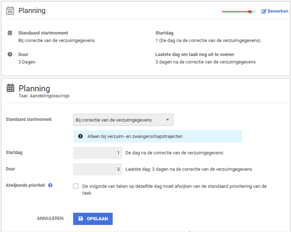Voor informatie over wanneer de taak naar voren komt is er het Planning panel, waar duidelijk beschreven staat wat het standaard startmoment is (standaard voor taken die toegevoegd worden via het protocol, triggers en andere manier om taken toe te voegen kunnen hier invloed op hebben). Ook is er een verduidelijkende tekst toegevoegd die uitlegt wat startdag precies betekent en wat het effect van de duur is. Als de prioriteit van de taak afwijkt van de standaard, wordt deze ook weergegeven. Met de blauwe knop 'bewerken' kun je deze instellingen ook aanpassen.