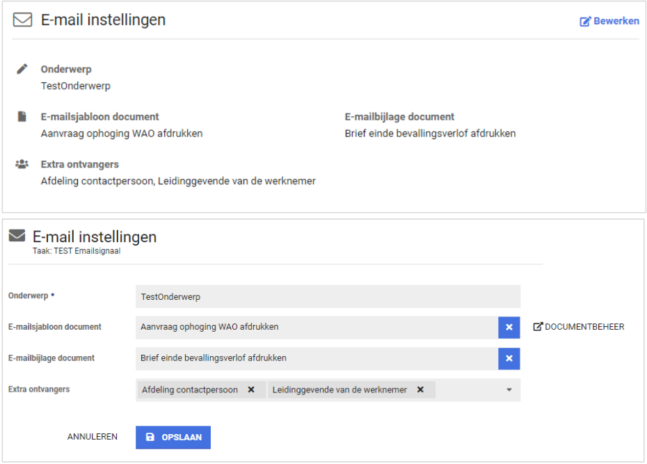 Voor e-mailsignalen is er een panel bij waar inzichtelijk gemaakt wordt of er een e-mailsignaal gekoppeld is aan de taak met de details die daarbij horen zoals te gebruiken e-mailsjabloon, eventuele bijlage en de extra ontvangers.