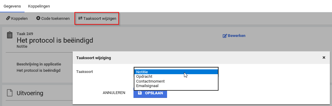 Het is vanuit het tabblad Gegevens ook mogelijk om de taaksoort te wijzigen. Het aanpassen van de taaksoort kan van invloed zijn op de panels die je kunt instellen.
