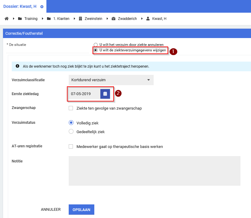 Stap 3. Kies voor de optie U wilt de ziekteverzuimgegevens wijzigen en pas de foutieve gegevens aan. Druk vervolgens op Opslaan en de wijziging wordt verwerkt.
