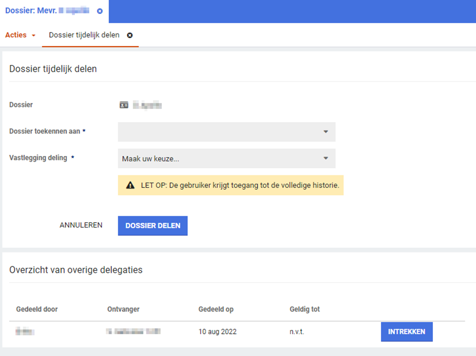 Geautoriseerde beheerders kunnen hiermee specifieke of alle delegaties van een dossier bekijken en intrekken als dat nodig blijkt te zijn (per dossier, bereikbaar via de actielink).