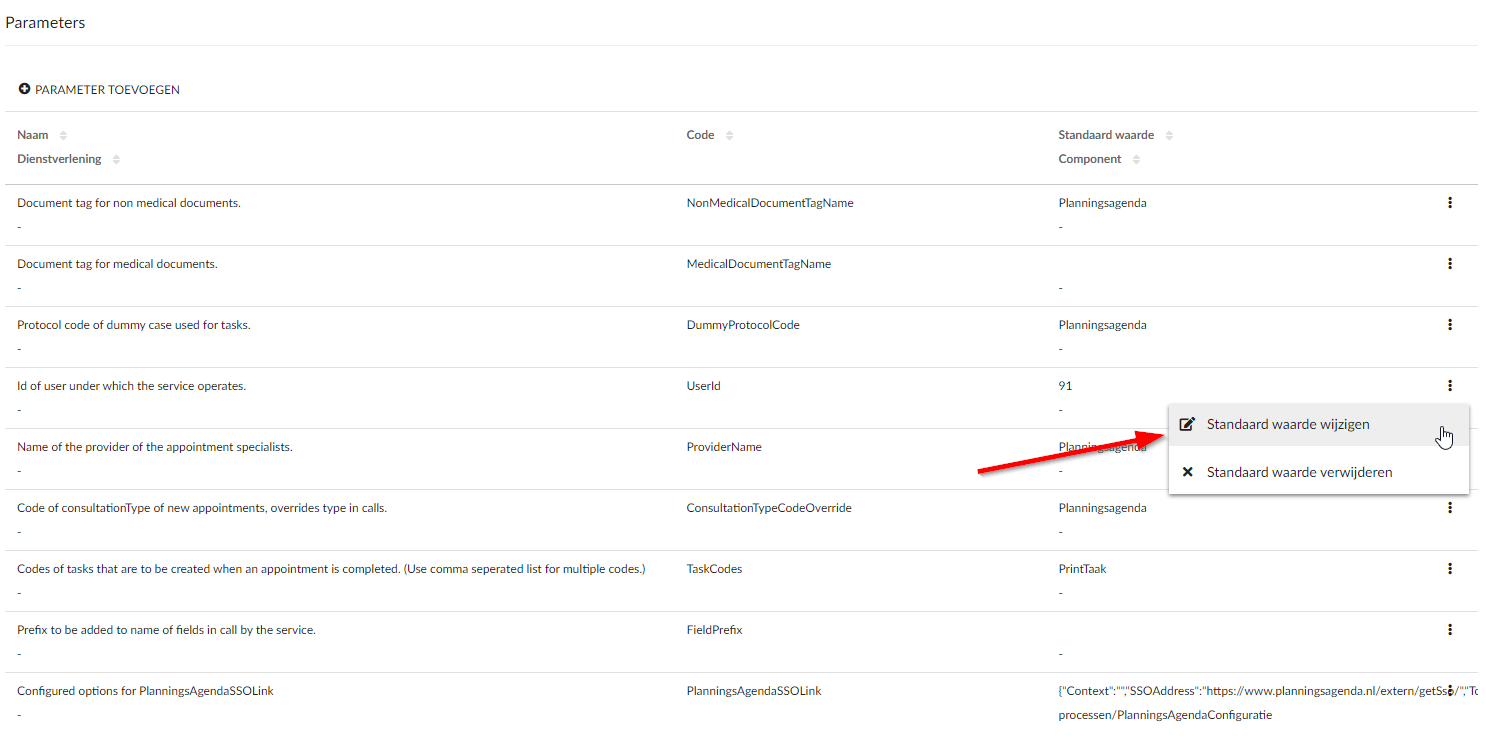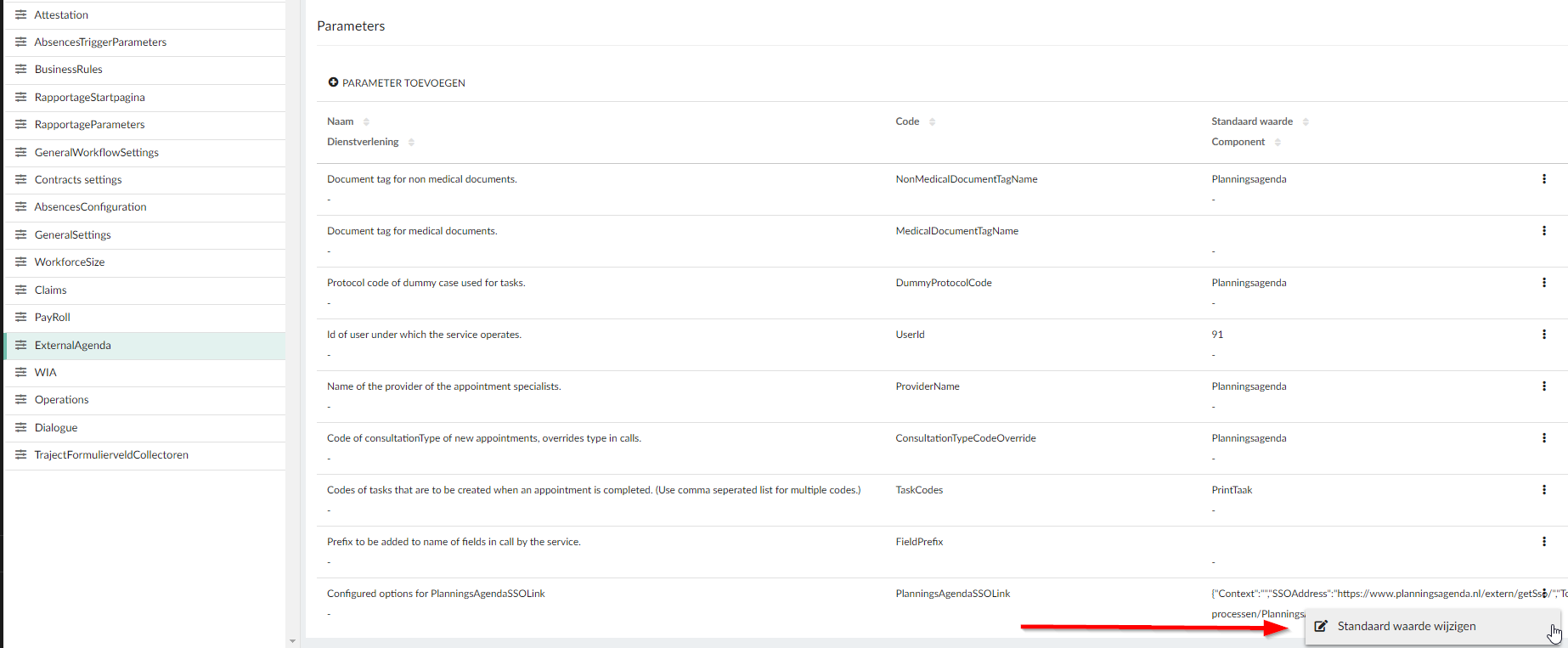 - Klik binnen deze groep op de parameter met de naam ‘Configured options for PlanningsAgendaSSOLink’ in het menu op de optie ‘Standaard waarde wijzigen’