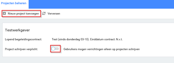 - Stap 3. Hier kunnen nieuwe projecten worden toegevoegd. Verder kan worden aangegeven dat alle verrichtingen op projecten moeten worden geschreven.