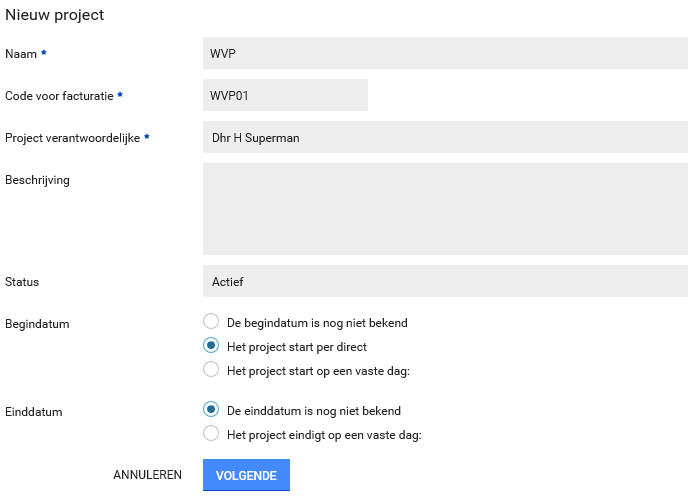 - Stap 4.5 Geef het project altijd een startdatum. De einddatum hoeft alleen ingegeven te worden als de einddatum bekend is.