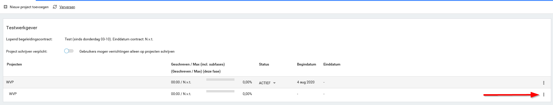 - Stap 7. In het overzicht is het zojuist aangemaakte project met de fase zichtbaar. Achteraan de regel kan het project of de fase bewerkt worden.