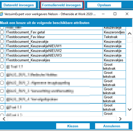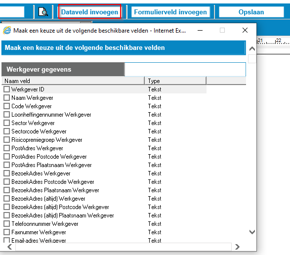 Met de knop: “Formuliervelden” zet je de zelfgemaakte formuliervelden in het scherm. Door op de knop Kiezen te klikken zet je het veld in het scherm.